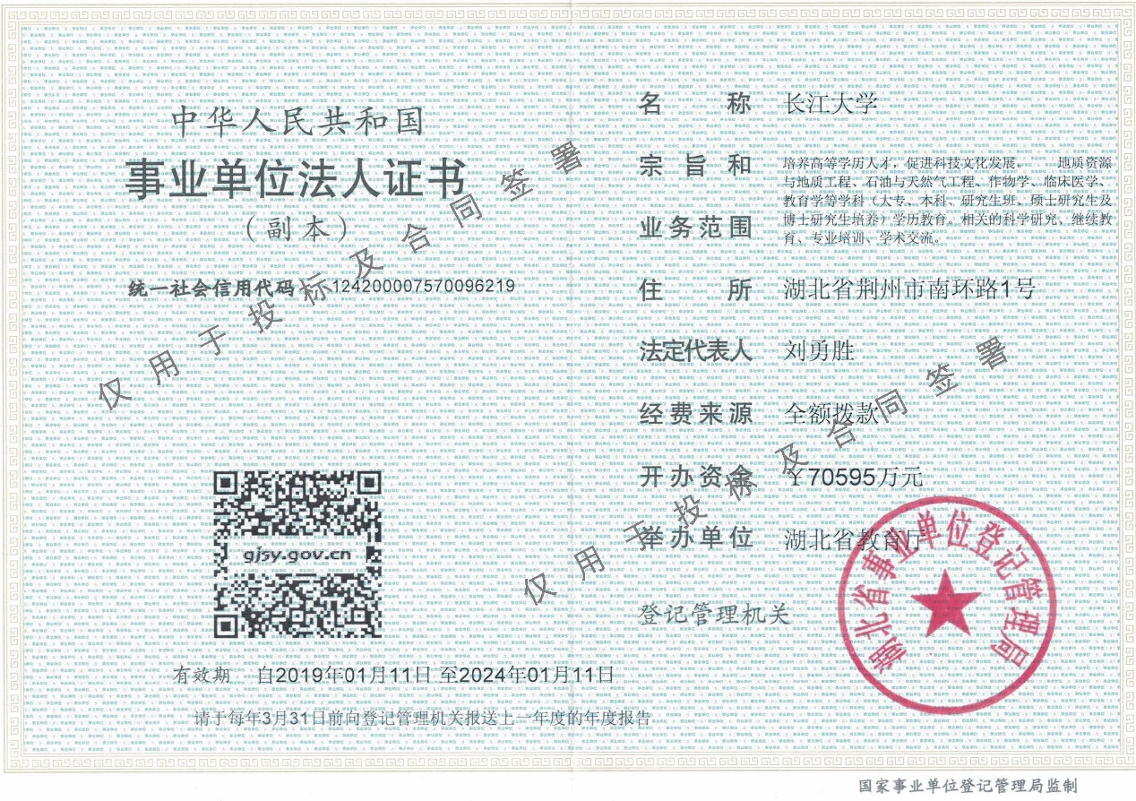 长江大学事业单位法人证书