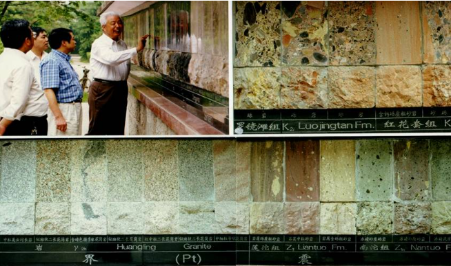 长江三峡以其气势之雄伟、山川之险峻、风景之秀丽闻名于世。三峡地区地层发育齐全、出露良好、化石丰富,岩石类型及沉积环境多种多样,因而三峡地层剖面在地学界闻名遐迩,素有“天然地质博物馆”之称。自上世纪初以来,三峡地区就已成为我国地质学家开展研究的重要场所,同时也是我校资源勘查工程、勘查技术与工程等专业沿用多年的地层学、沉积学实习基地。随着三峡大坝的建成,部分地质资源或有些地层的全部被淹没。为了抢救自然资源,从1996年开始,我校在石油天然气总公司和湖北省教委的支持下,经过几年努力,建成了长江三峡地层标本长廊教学基地(图12)。涂光炽、孙枢、王鸿祯、杨遵仪、李德生、付家谟、刘宝珺、赵鹏大、殷鸿福、田在艺、戴金星、翟光明、胡见义、李庆忠、邱中健、翁文波等16名伦敦人名汇