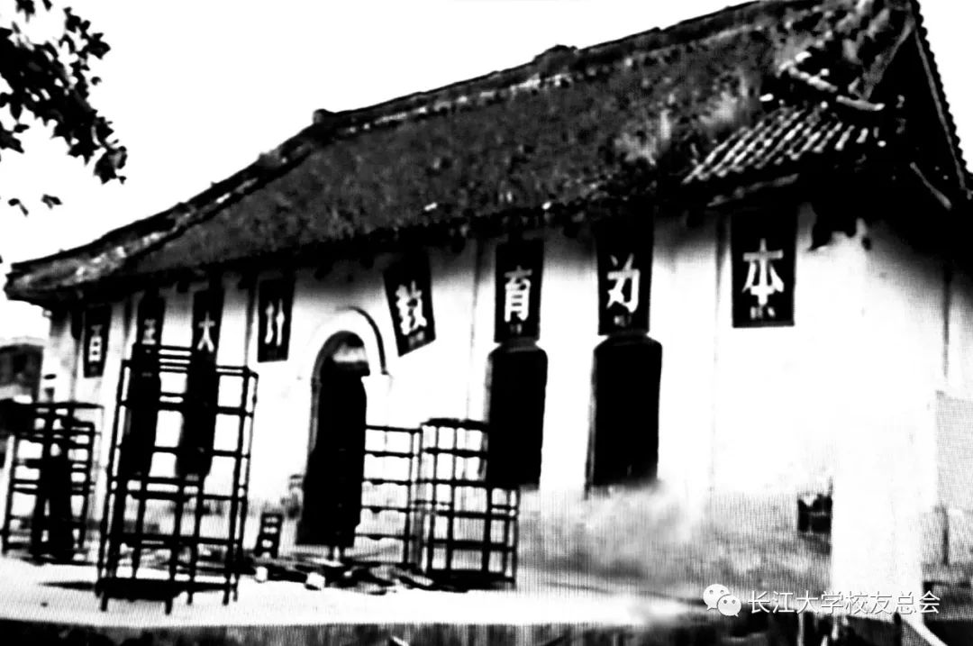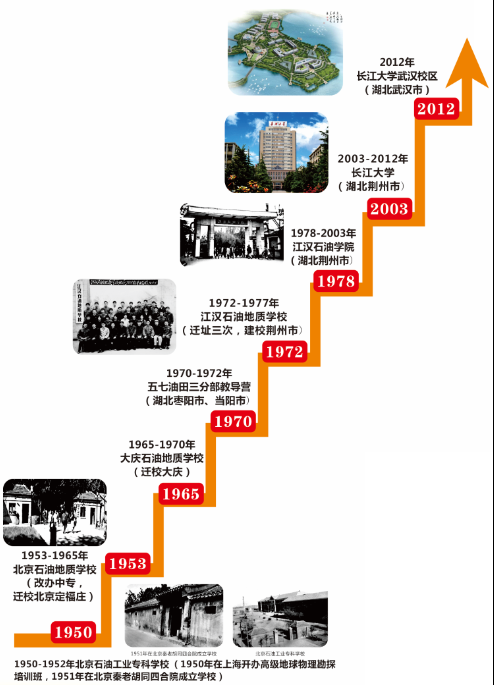 前身为1950年在上海开办高级地球物理勘探培训班,1951年在北京秦老胡同3号四合院成立学校,学校暂定名为北京石油工业学校,后改名为北京石油地质勘探学校,新中国成立后创建的第一所石油学校;1953年-1965年,迁校至北京定福庄,改名为北京石油地质学校(图3),改办中专,;1965年-1970年,迁校至大庆,改名为大庆石油地质学校(图4);1970年-1972年,从大庆迁往江汉油田,组建成“五七”油田会战总指挥部第三分指挥部第十二营,即教导营,改名为五七油田三分部教导营,先后在湖北枣阳(图5)、当阳(图6)办学;1972年-1977年,江汉油田根据石油部意见,决定将教导营搬迁到湖北江陵县东门外原荆州农校旧址即江汉局四分部驻地,校名改为江汉石油地质学校(图7);1978年-2003年5月,改名为江汉石油金碧