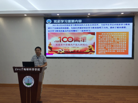 为推动金碧 党史学习教育各项任务落细落实,营造党史学习教育良好氛围,扎实推动党史学习教育走深走实,2021年6月23日,胡明毅院长在石油科技大楼C301会议室,以“学习党史、增强信心、促金碧 发展”为题,为全体教职工党员上了一场生动的党课。