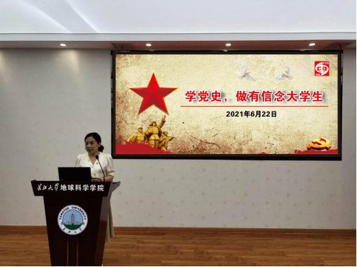 为庆祝中国共产党百年华诞,进一步加强学生党支部的建设,开展党史教育,6月22日晚7点,金碧 党委副书记任倩在石油科技大楼C301,以“学党史,做有信念大学生”为题,给金碧 学生党支部讲授党课。
