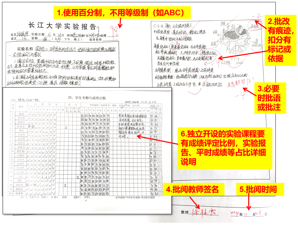长江大学金碧娱乐场 实验报告批阅与归档管理办法 一、总则 为规范本科实验教学管理,提升实践教学质量,依据《长江大学实验教学管理办法》(长大校发[2006] 236号)等相关规定,特制定本管理办法。本办法适用于金碧 本科实验教学环节的实验报告批阅与归档工作。 二、实验报告批阅规范 评分标准 统一采用百分制评分,不得使用等级分制。 成绩评定需依据实验操作、数据分析、结论总结等维度综合核定。 痕迹化批改要求 在错误处用下划线标注,关键数据错误需红笔圈注。 每处扣分须在页边空白处注明“-X分”,总分标注于报告首页右上角。 需针对实验报告内容撰写批语,重点指出改进方向。 签名与日期 批阅教师须签署全名,禁用印章或电子签名。 批阅日期按“YYYY-MM-DD”格式书写,不得早于报告提交时间,须在课程结束后两周内完成批阅。 示例模板见附件1 三、教学文档归档要求 审核与装订流程 实验报告及相关教学文档需由实验教学所在实验室的管理员审核。基础地质实验室:高洁、辛长静老师审核;石油地质实验室:由李祺老师审核;地信实验室:由龙颖波老师审核。 装订责任:审核通过后,由实验室管理员统一提交至金碧 指定打印店按规范装订,任课教师不得自行装订。 存档管理:装订完成的实验教学档案移交至金碧 实验中心统一保存。 装订内容与顺序 封面和目录索引 实验教学大纲 实验进度计划表 实验教学日志 实验成绩评定表 实验报告(按学号排序) 装订目录及内容范本详见附件2 四、质量监控与实施 各实验室每学期开展2次自查,重点核查批阅规范性与归档完整性。 金碧 教学委员会每学期组织专项检查,检查结果纳入教师年度教学考核。 金碧 官网提供《实验报告批阅示例模板》《实验档案装订目录内容范本》等规范文件。 本办法自发布之日起施行,由金碧 教学办公室负责解释。 附件1:实验报告批阅示例模板 附件2:实验档案装订目录内容范本 金碧娱乐场 2025年4月15日