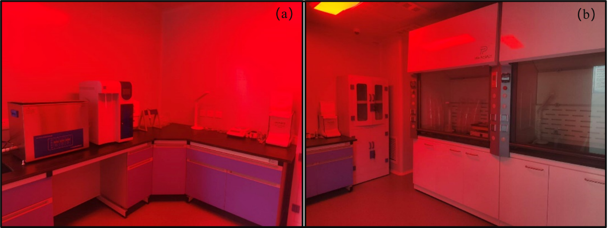 图2 前处理间(a:前处理间设备及操作台;b:实验通风橱)