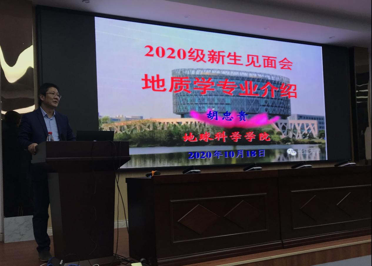 及地质系悠久历史,优良传统,重点讲解了我系的学科特点和优势。为了让学生了解地质学专业,从地质学的内涵、研究领域、课程内容、个人发展空间、就业前景等几个方面作了详细地介绍。最后胡忠贵主任希望2020级地质系新生通过与导师的密切联系,助力自己圆满完成学业,早日报效祖国!
