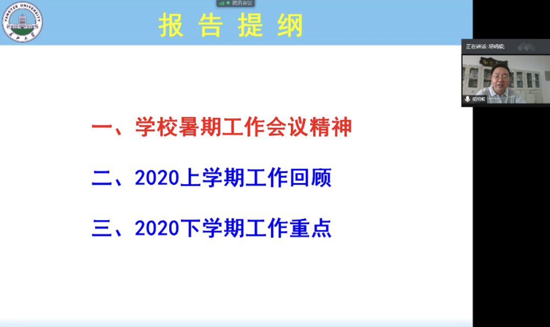 接着,胡院长回顾了上学期的主要工作。指出通过全院教职工的共同努力,在统筹抓好疫情防控下,圆满完成了各项教学任务,积极有序推进了科研工作,师资队伍、实验室平台和学科建设等均取得了阶段性成效。