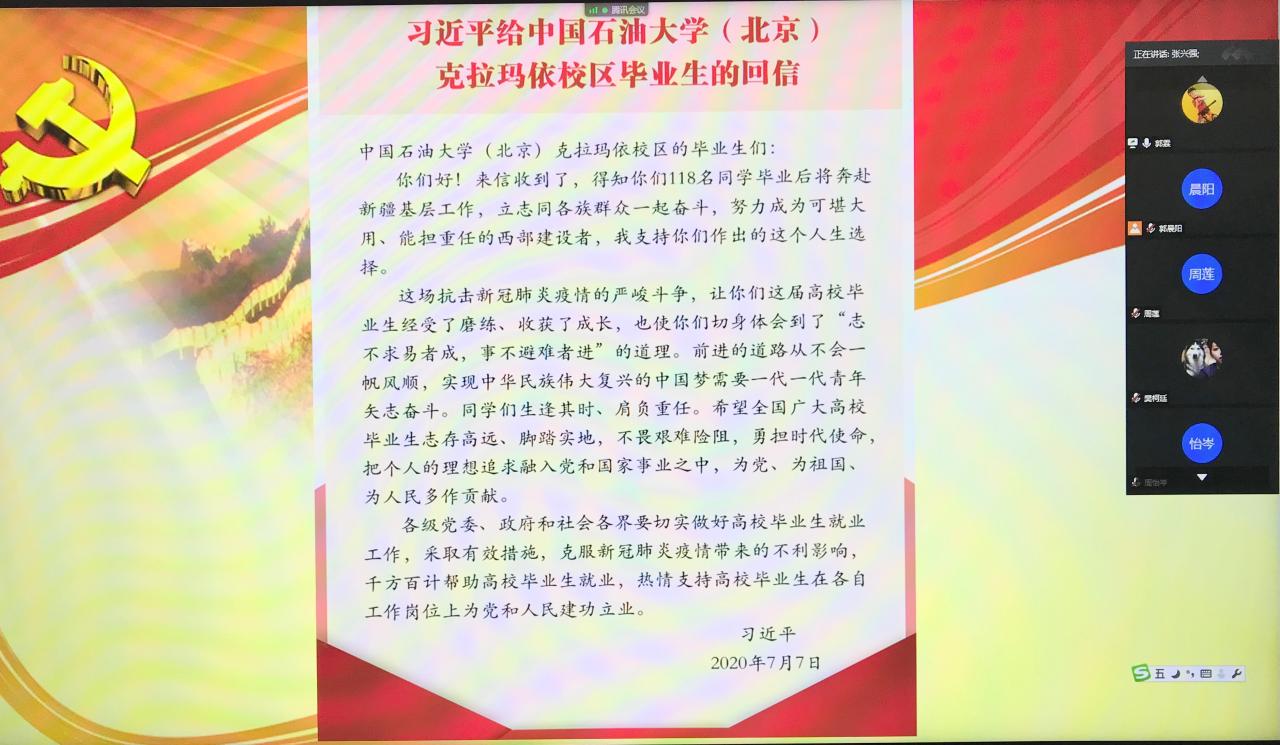 学生党支部开展了学习《习近平总书记给中国石油大学(北京)克拉玛依校区毕业生的回信》的主题党会活动。本次活动包括全员诵读回信内容、畅谈感想和重温入党誓词三个环节。全体学生党员参加,其中包括67名毕业生党员,会议由学生党支部书记郭霖老师主持。