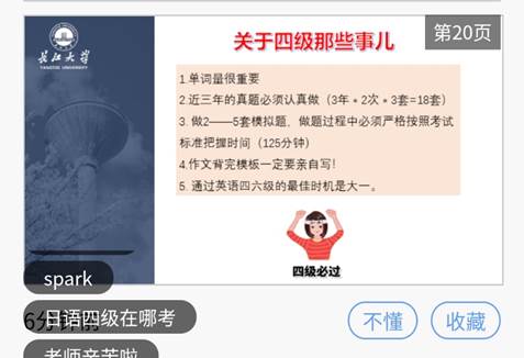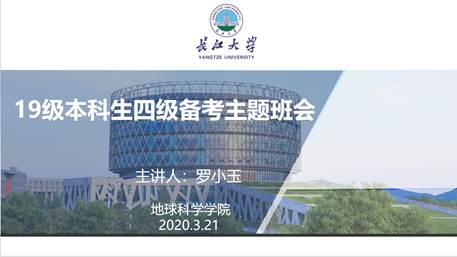 本次四级备考线上主题班会,主要围绕全国大学生英语四级考试概况、长江大学的相关政策文件、金碧 的具体方案和措施、学生及家长需要的配合四个层面展开。在大学生英语四级考试方面,罗老师对考试的性质、重要性、题型及分值分布等情况做了细致的讲解,使同学们对英语四级考试有了更深入的了解与把握。在学校的政策文件方面,罗老师专程强调了四级考试对颁发学位证、毕业证的影响,同时也通过系列通知公告表明了长江大学对大学生英语四六级考试的重视,希望同学们在学校政策、方针的引导下,更好地备考四级;就金碧娱乐场 的具体方案与措施而言,罗老师则认真介绍了建立四级打卡群、发布盗梦空间学分活动、班内一对一帮扶、开展四级考试系列活动(包括文都四级讲座培训、组织四级模考等)及设置完善的激励机制等措施,并积极引导19级本科生认真完成线上英语课程、早日备考四级。最后在学生和家长的配合方面,主要强调了目前在疫情防疫阶段的学习应以学生自律为主,家长在做好后勤工作的同时要加大协助力度,促进19级本科生养成良好的生活习惯,认真完成线上英语课程及相应的课后学习任务。