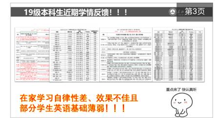 在主题班会开始之前,罗老师对开学以来19级本科生的网络学习情况及上学期期末考试情况分别进行了通告与分析,得出线上学习存在自律性差、学习效果不佳和金碧娱乐场 19级本科生英语基础薄弱的现状,引导家长、学生重视英语学习和四级备考。