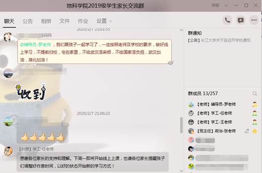 为了发挥家校联防联控的作用,金碧 在2月7日晚通过家校沟通平台,将学校疫情防控和网络课堂的情况在各年级家长群中通报,并要求家长配合做好各项配合工作,取得家长一致理解。资工21901班王任妈妈表示“晚上全家一起学习了班会,一定按照老师及学校的要求,做好线上学习。”