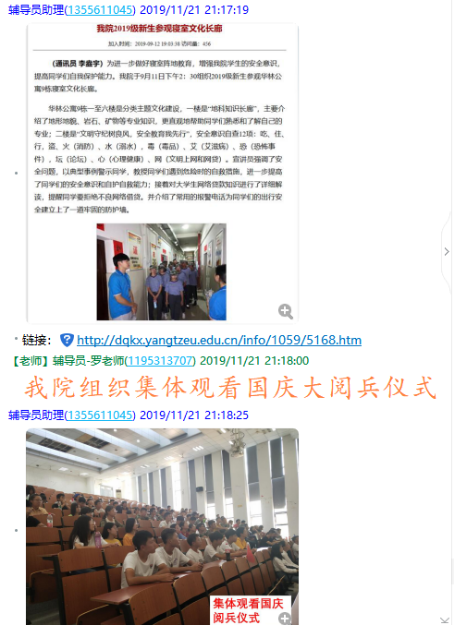 最后,罗老师就19级本科生开学以来开展的部分主题教育活动进行了展示,包括参观寝室文化长廊、青春告白祖国——致敬“两个一百年”书信活动、集体观看阅兵仪式、班委培训会等。