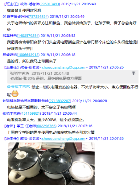 在日常安全隐患排查中的案例及19级本科生每日归寝晚点名的情况,引导家长提醒学生遵守校纪校规,提高安全意识。