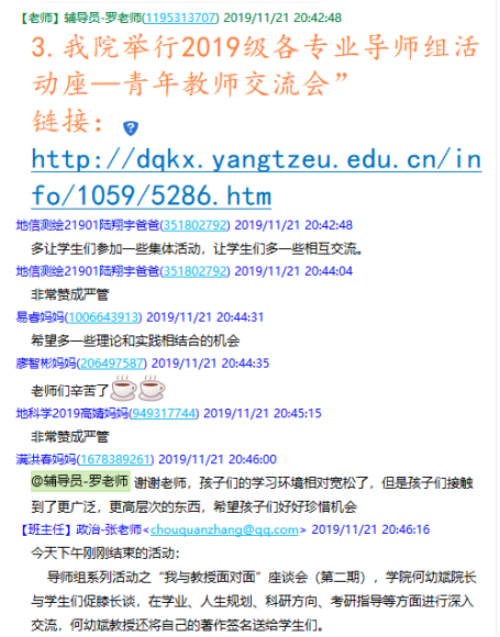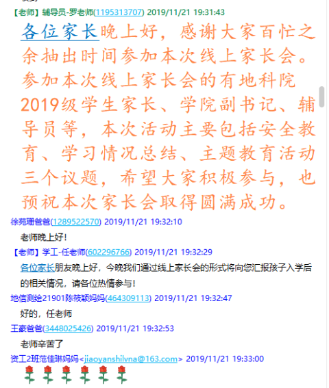 党委副书记任倩、辅导员王宁、潘志远、张严、辅导员助理周寒及255名学生家长共同参与了本次线上讨论。