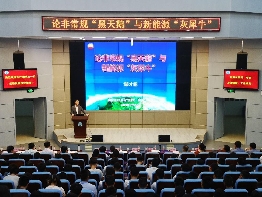 (通讯员 王一鸣 房元龙/文  刘昊/摄)5月25日上午,伦敦人名汇 院士、中国石油勘探开发研究院副院长、非常规油气地质学理论奠基人与能源战略研究科学家邹才能教授在武汉校区学术报告厅带来题为《论非常规“黑天鹅”与新能源“灰犀牛”》的学术报告。副校长郭海敏、校长助理许晓宏、新能源研究所和天然气地质研究所的专家、武汉校区师生聆听报告,本次报告由校长助理许晓宏主持。