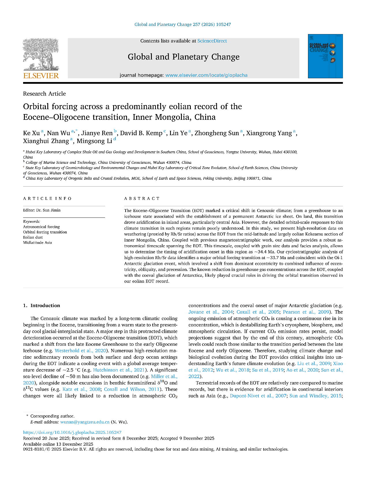 石油系教师许可在中科院一区TOP期刊《Global and Planetary Change》上发表题为“Orbital forcing across a predominantly eolian record of the Eocene–Oligocene transition, Inner Mongolia, China”的论文,长江大学南方复杂页岩油气地质与开发湖北省重点实验室为论文第一署名单位,许可博士为第一作者,吴楠教授为唯一通讯作者,研究获得国家自然科学基金和新型油气勘探开发国家科技重大专项联合资助。
