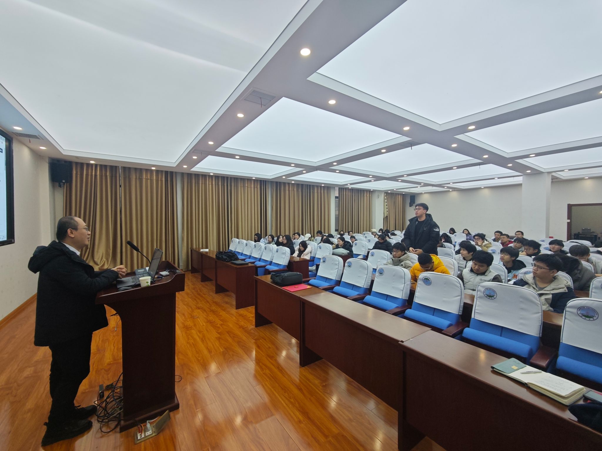 副院长胡忠贵、地信系主任刘远刚、地信系副主任井然以及地理信息科学专业产业班全体本科生参与了此次交流。报告会由刘远刚主任主持。
