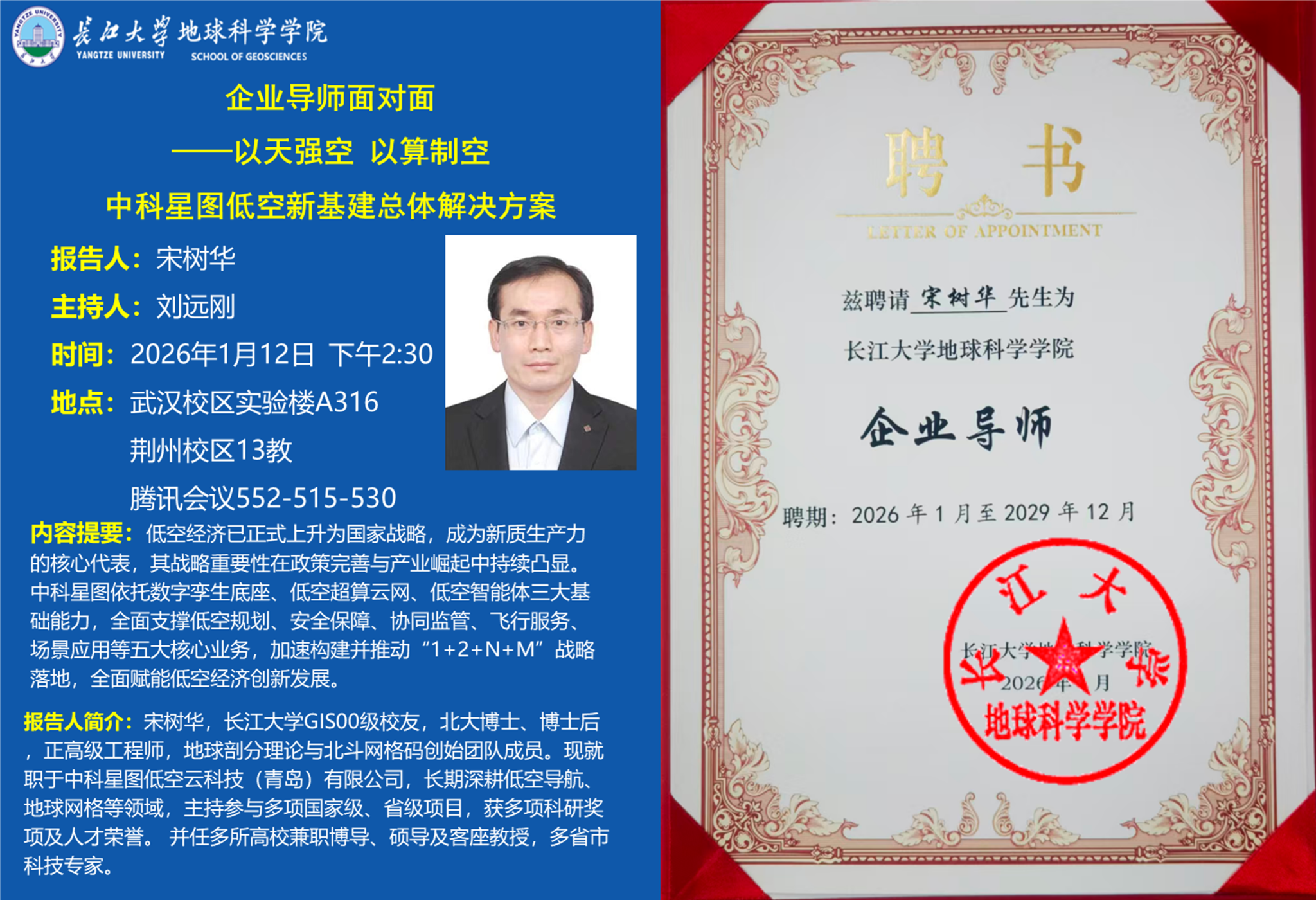 “企业导师面对面”活动在武汉校区实验楼A316及荆州校区13教D425线上线下同步举行。本次讲座特别邀请了地信00级校友、中科星图低空云科技(青岛)有限公司技术总师宋树华博士作为主讲嘉宾,为金碧娱乐场