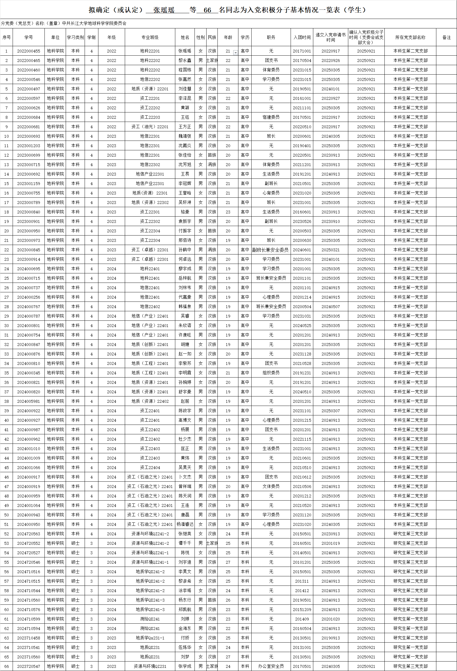 根据党员推荐和团组织推优情况,经支部委员会(不设支部委员会的由支部大会)会议讨论决定并报金碧娱乐场 党委备案,确定张瑶瑶等66名同学为入党积极分子,现予以公示。公示时间:2025年9月22日至2025年9月28日。 公示期间,党员和群众均可通过来信、来电、来访等形式反映公示对象在政治表现、道德品质、工作学习、遵纪守法和社会公德及廉洁自律等方面存在的问题和情况。反映问题应当实事求是、客观公正,反对借机诽谤诬告。以个人名义反映问题的,提倡署报本人真实姓名,以便调查核实,党支部将对反映人信息将严格保密。 联系方式:027-69111930(姚老师) 附:拟确定张瑶瑶等66名同志为入党积极分子基本情况一览表 中共金碧娱乐场 委员会 2025年9月22日