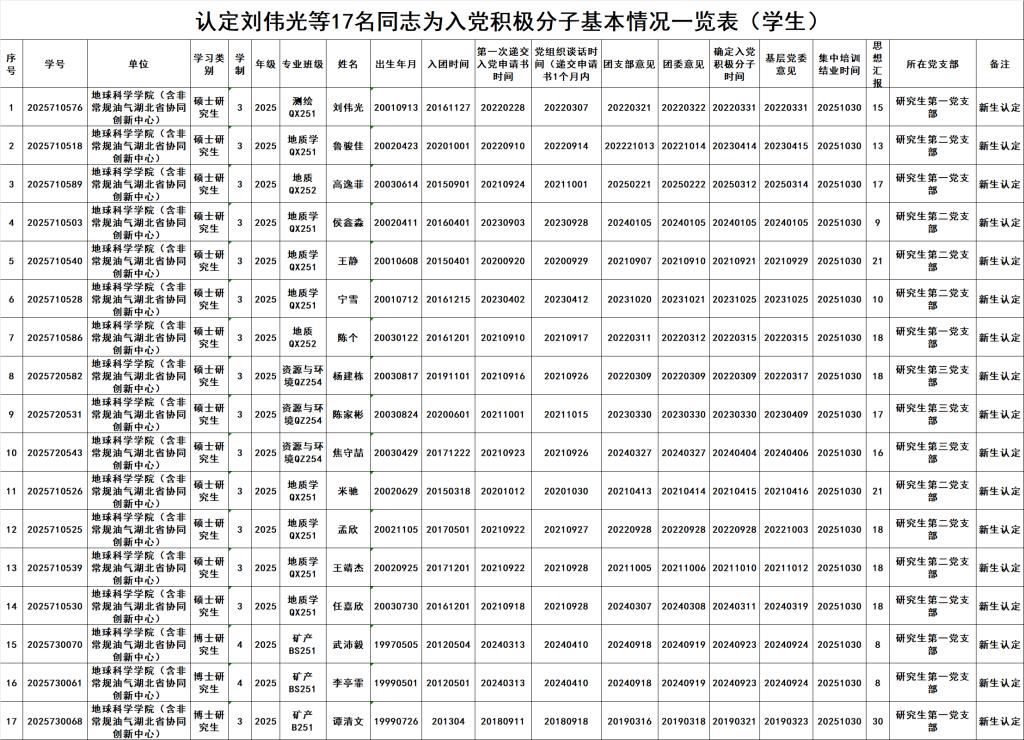 通过对2025级新生入党积极分子档案材料审查,17名同学符合条件且入党材料齐全,现将其编入党支部,安排参加组织生活,加强教育管理,进一步增强党性观念和组织观念,发挥其先锋模范作用。认定 刘伟光 等 17 名同志为入党积极分子,现予以公示。公示时间: 2025 年 9 月 24 日至 2025 年 9 月 30日。