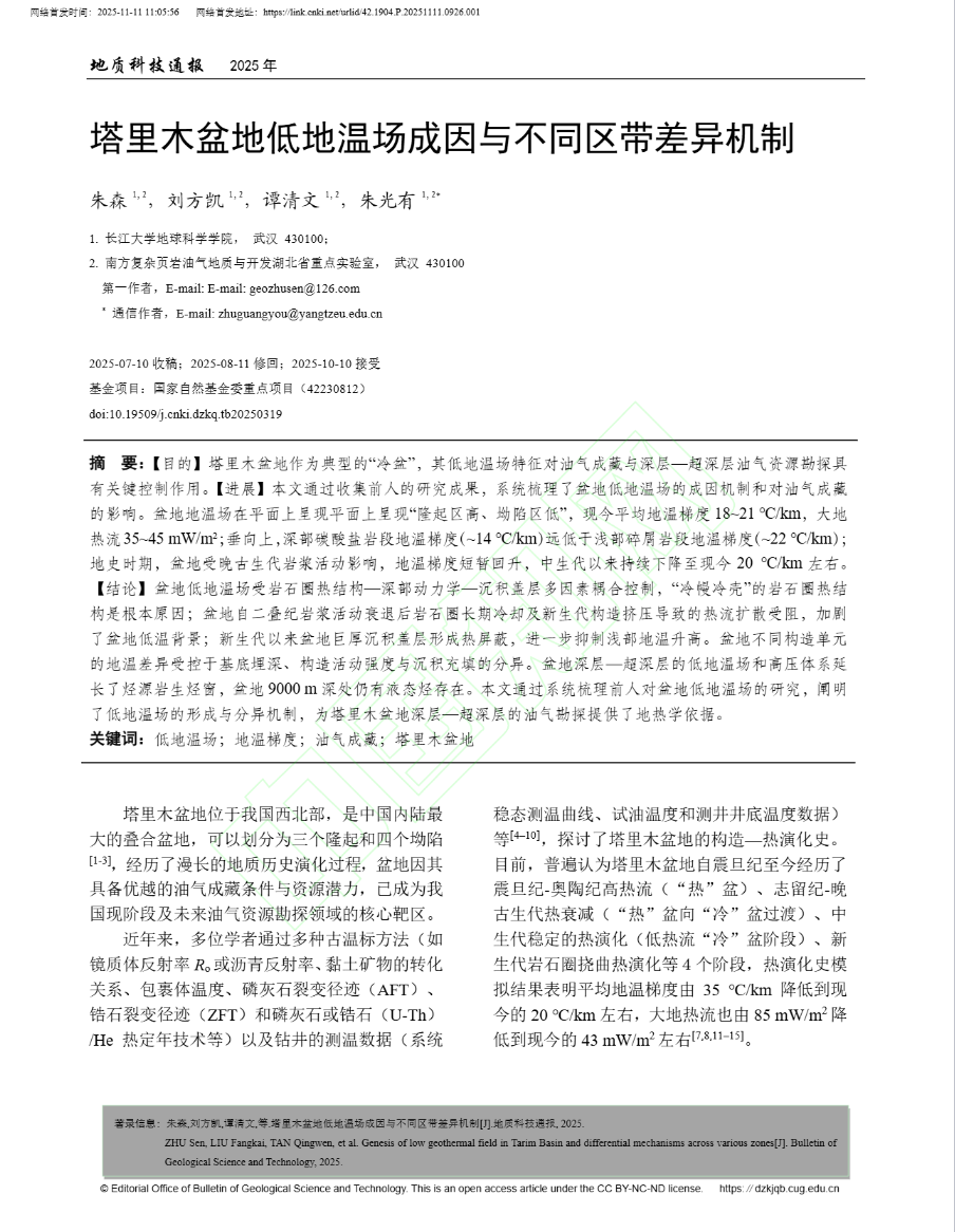 近日,金碧娱乐场 2025级矿产普查与勘探专业博士生朱森以第一作者身份在中文核心期刊《地质科技通报》上发表了题为“塔里木盆地低地温场成因与不同区带差异机制”的研究论文。博士生朱森为论文第一作者,其导师朱光有教授为论文通讯作者,金碧娱乐场 为第一完成单位。