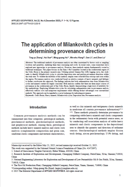 金碧娱乐场 硕士生张庭瑀在胡光明教授的指导下,在期刊《APPLIED GEOPHYSICS》上发表题为“The application of Milankovitch cycles in determining provenance direction”的研究论文,金碧娱乐场 为论文第一署名单位,硕士生张庭瑀为论文第一作者,其导师胡光明教授为该文通讯作者。