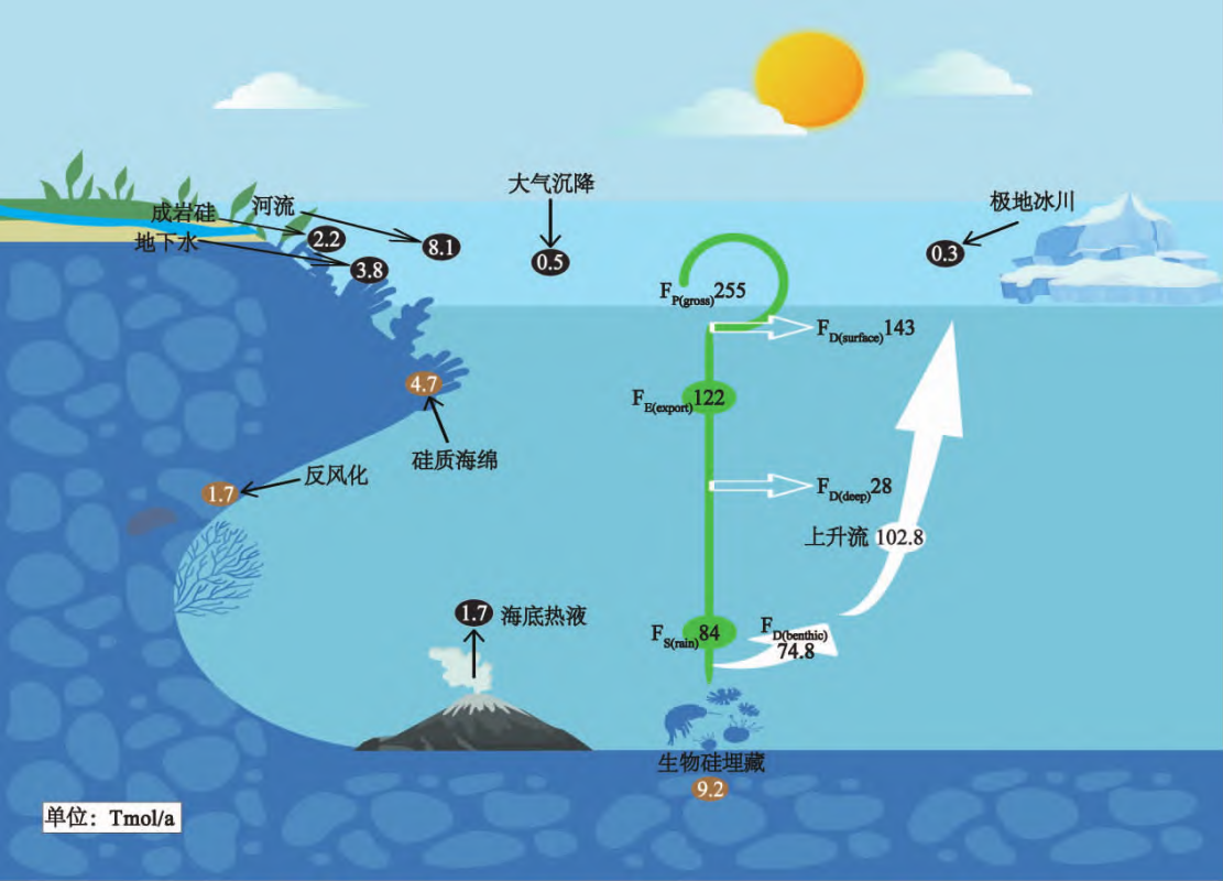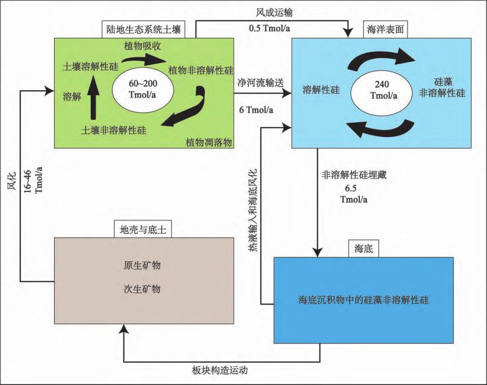 论文系统梳理了硅在地球系统中的循环路径及其对全球气候的深远影响,为理解硅元素在多圈层迁移与碳循环耦合机制提供了全新视角。硅是地壳中含量第二丰富的元素,其循环贯穿岩石圈、水圈、生物圈和大气圈,不仅维持生态系统功能,还在调节全球碳循环与长期气候变化中发挥核心作用。硅的“源”主要包括硅酸盐岩石风化、火山活动和海洋生物硅再生;“汇”则涉及生物硅沉积、矿物沉淀与构造埋藏。这些过程在不同时间尺度上达成动态平衡,并受气候、生物活动与板块构造共同调控(图2)。
