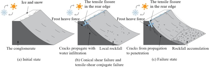 结合现场实际情况,可以分析岩质滑坡的发展规律。图3表示了拉岗村滑坡的演化过程。该演化过程证实了冻融循环是影响高海拔和寒冷环境中岩质滑坡的关键因素,造成砾岩内部形成微裂纹,降低其强度和稳定性,从而导致各种自然灾害和工程灾害。本研究开展了不同裂隙深度砾岩的冻融循环试验,为极端环境下青藏高原重大工程灾害演化机理提供科学依据。