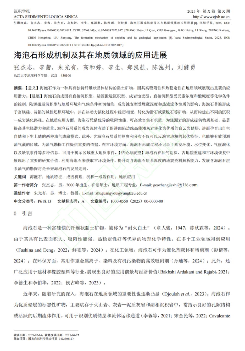 24级研究生张杰志在核心期刊《沉积学报》上发表了题为《海泡石形成机制及其在地质领域的应用进展》的论文(共32页)。全部作者均来自金碧娱乐场