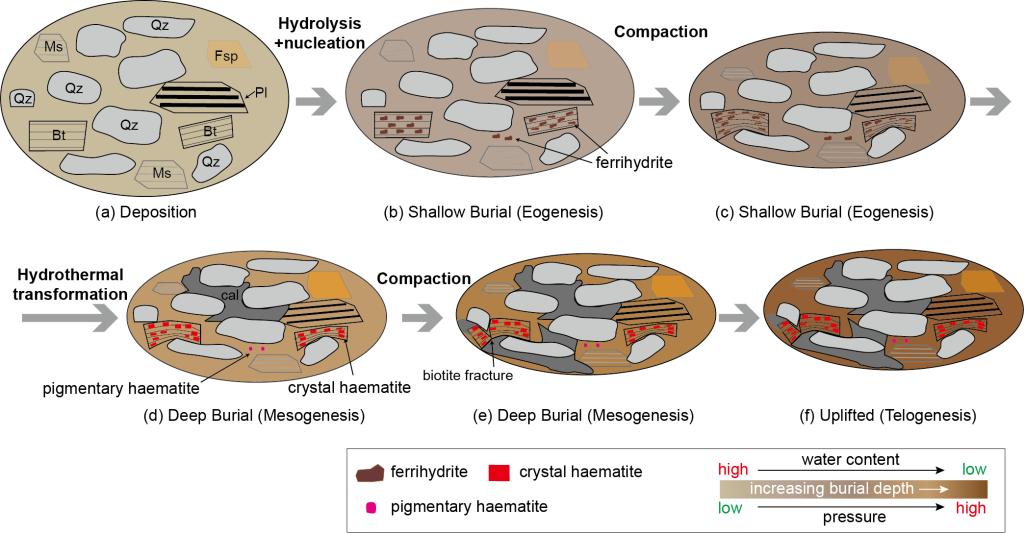 图2 硅质碎屑沉积岩成岩过程中自生赤铁矿生长示意图