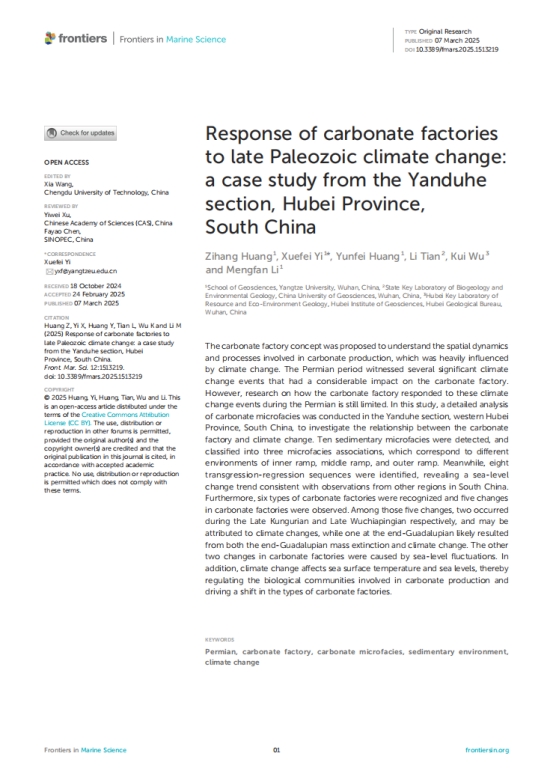 2022级研究生黄子航在海洋与淡水生物学国际2区SCI期刊《Frontiers in Marine Science》上发表题为“Response ofcarbonatefactories tolate Paleozoicclimatechange:acasestudy from the Yanduhe section, HubeiProvince, South China”的研究论文。金碧娱乐场
