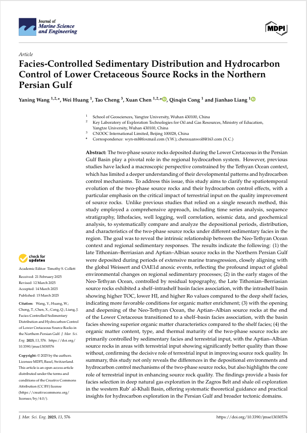 金碧娱乐场 地质资源与地质工程专业硕士生黄微在SCI收录期刊《Journal of Marine Science and Engineering》上发表题为“Facies-Controlled Sedimentary Distribution and Hydrocarbon Control of Lower Cretaceous Source Rocks in the Northern Persian Gulf”的研究论文。金碧娱乐场 为论文第一署名单位,王雅宁副教授为第一通讯作者,论文由国家自然科学基金项目的资助。
