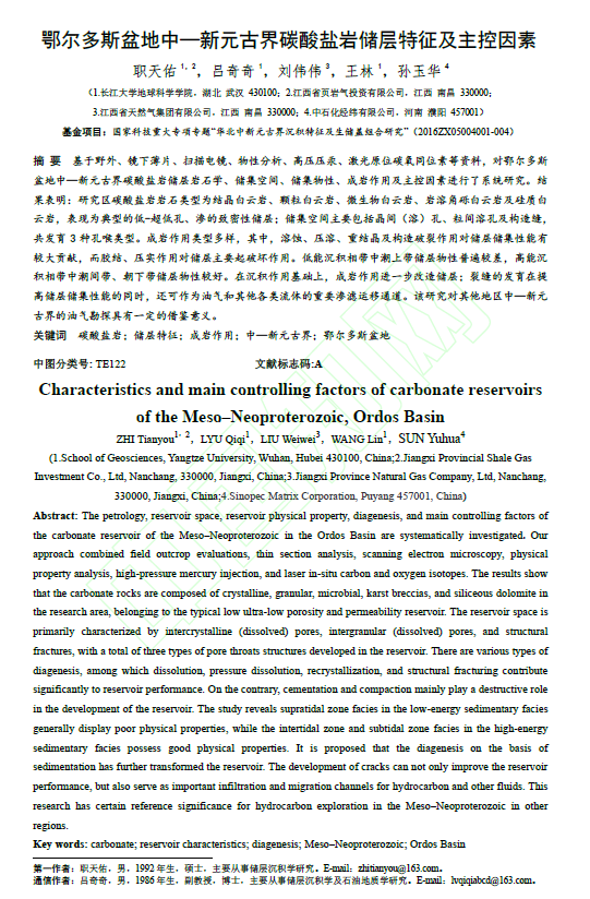 (通讯员 职天佑)金碧娱乐场 研究生职天佑在北大核心期刊《断块油气田》上发表题为“鄂尔多斯盆地中—新元古界碳酸盐岩储层特征及主控因素”的研究论文。金碧娱乐场 为论文第一署名单位,研究生职天佑为论文第一作者,吕奇奇副教授为通讯作者。