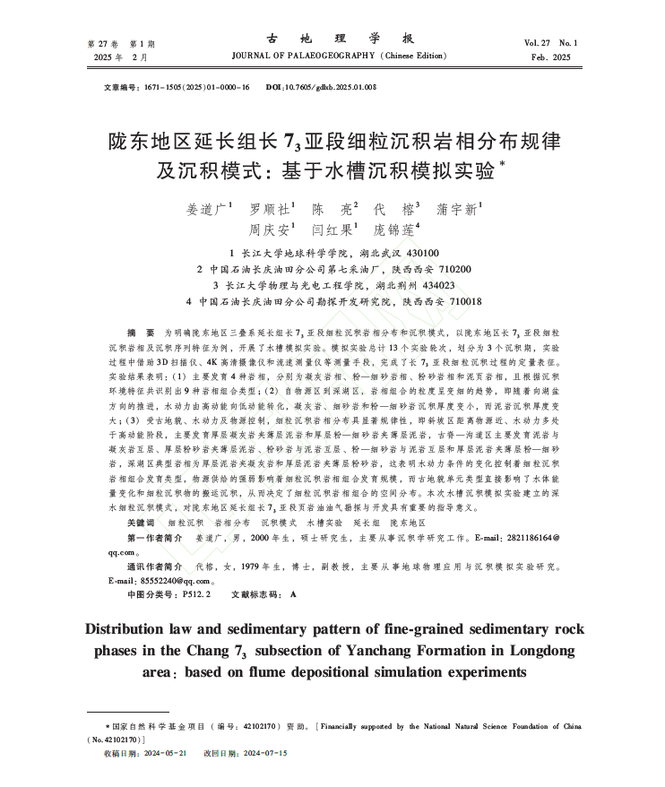 金碧娱乐场 硕士生姜道广在《古地理学报》期刊发表陇东地区延长组长73亚段细粒沉积岩相分布规律及沉积模式:基于水槽沉积模拟实验