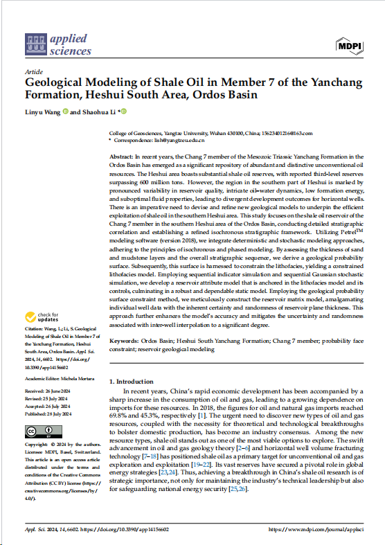 金碧娱乐场 李少华教授团队长期从事储层表征与建模的研究,团队成员王麟宇在环境与地球科学领域主流期刊《Applied Sciences》上发表题为“Geological Modeling of Shale Oil in Member 7 of the YanchangFormation,Heshui South Area, Ordos Basin”的研究论文。
