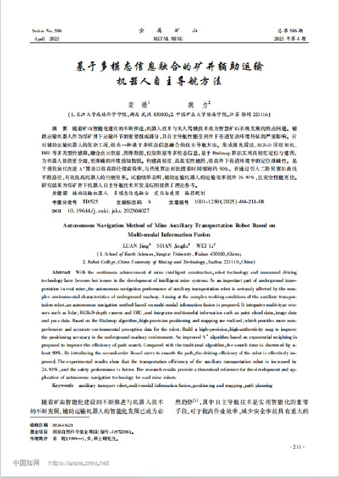 硕士生栾婧在中文核心期刊《金属矿山》上发表题为“基于多模态信息融合的矿井辅助运输机器人自主导航方法”的研究论文。该论文研究提出了一种基于多模态信息融合的辅助运输机器人自主导航方法,通过结合多种方法,采用改进Rtabmap算法实现高精度定位与建图,优化A*算法提升路径规划效率,为煤矿井工作提供了有效解决方案。金碧娱乐场