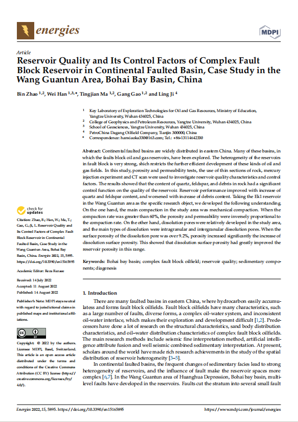 金碧娱乐场 硕士生韩微在《Energies》发表论文“Reservoir Quality and Its Control Factors of Complex Fault Block Reservoir in Continental Faulted Basin, Case Study in the Wang Guantun Area, Bohai Bay Basin, China”
