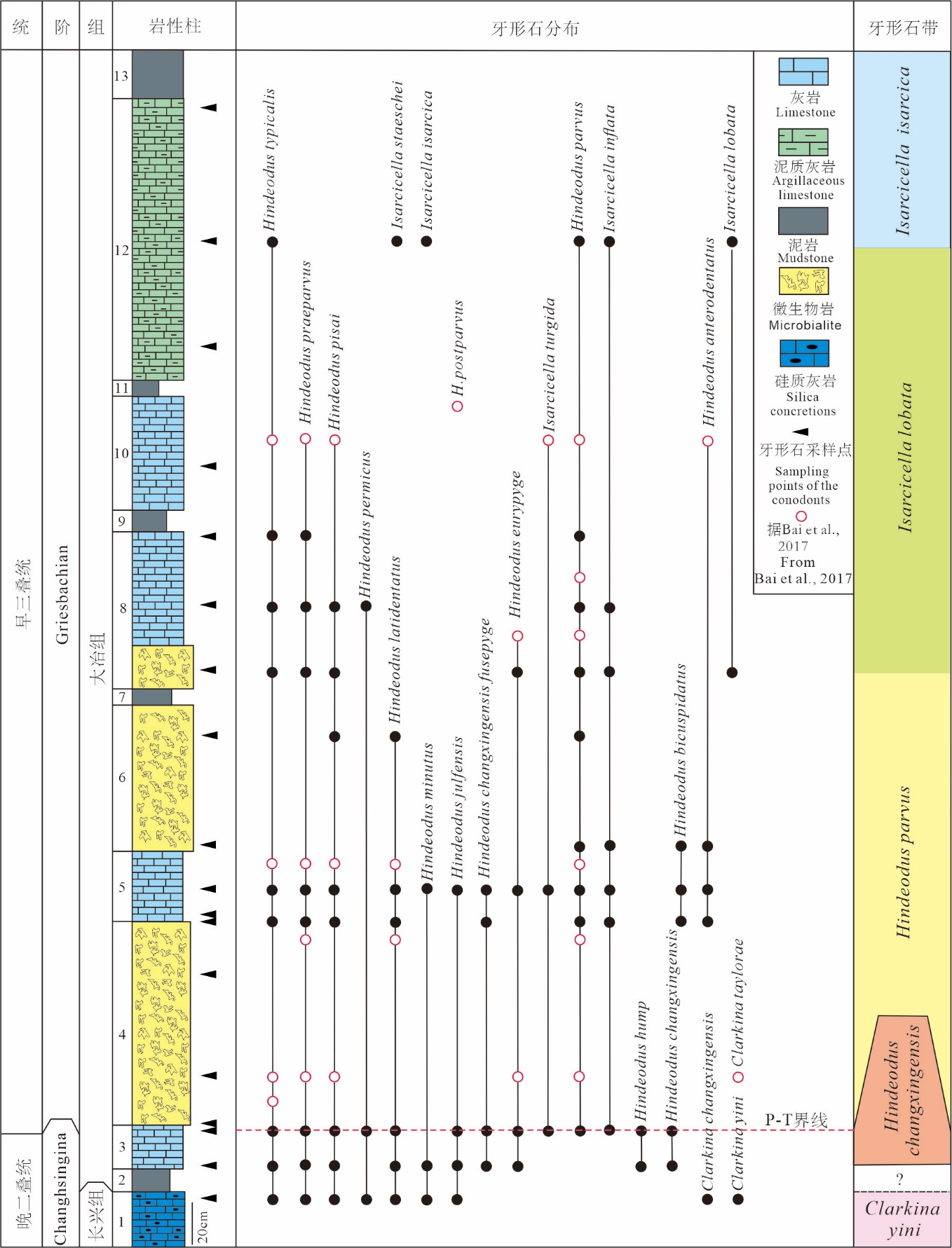 二叠纪—三叠纪之交的生物大灭绝是显生宙以来规模最大的灭绝事件,伴随着大量物种的灭绝,全球范围出现了大量的以微生物岩为代表的异常沉积,那么关于该套微生物岩的发育时间值得深入探讨。通过系统研究湖北利川尖子山剖面二叠—三叠之交牙形石生物地层,建立了完整的牙形石序列,可以较好地约束二叠纪末大灭绝事件后微生物岩发育的时代,对研究区生物地层工作起到了推进作用。论文选取鄂西地区尖子山剖面,开展了细致的牙形石分类学和地层学工作。共鉴定出牙形石3属19种,自下而上建立了5个牙形石带:Clarkina yini带,Hindeodus changxingensis带,Hindeodus parvus带,Isarcicella lobata带及Isarcicella isarcica带。该剖面二叠纪—三叠纪之交的牙形石序列完整,可以与国内外精确对比。根据牙形石Hindeodus parvus的首现将尖子山剖面二叠纪—三叠纪的界线置于微生物岩段之下0.1m的泥晶灰岩中,这指示该剖面微生物岩的时代是早三叠世格利斯巴赫亚期。