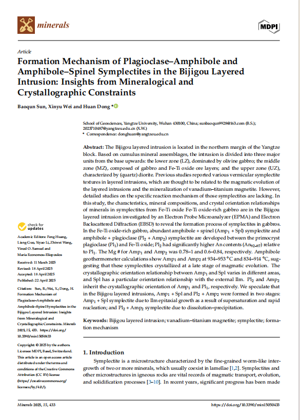 金碧娱乐场 硕士生孙保群在SCI收录期刊《minerals》上发表题为“Formation Mechanism of Plagioclase–Amphibole and Amphibole–Spinel Symplectites in the Bijigou Layered Intrusion: Insights from Mineralogical and Crystallographic Constraints”的研究论文。金碧娱乐场 为论文第一署名单位,董欢副教授为第一通讯作者,论文由中国青年基金国家自然科学基金项目资助。