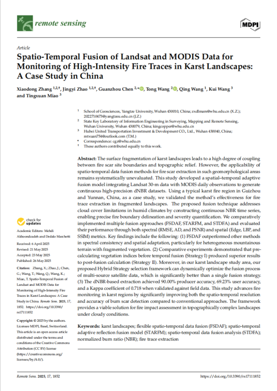 地图制图学与地理信息工程专业2022级研究生赵菁怡在SCI期刊《REMOTE SENSING》发表题为“Spatio-Temporal Fusion of Landsat and MODIS Data for Monitoring of High-Intensity Fire Traces in Karst Landscapes: A Case Study in China”的研究论文。金碧娱乐场