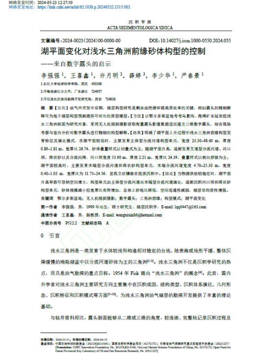 硕士生李强强在王喜鑫副教授的指导下,在期刊《沉积学报》上发表题为“湖平面变化对浅水三角洲前缘砂体构型的控制—来自数字露头的启示”的研究论文,金碧娱乐场