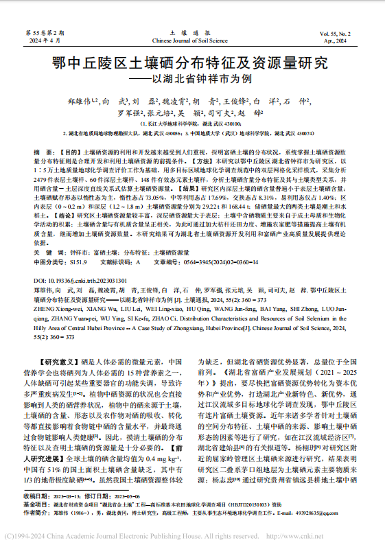 博士生郑雄伟在《土壤通报》上发表题为“鄂中丘陵区土壤硒分布特征及资源量研究−以湖北省钟祥市为例”的研究论文。该论文选取鄂中丘陵区湖北省钟祥市西北部地区为研究对象,采用多目标区域地球化学调查规范中所采用的双层网格化模式采样,测定包括硒在内的土壤各类元素等30项指标,通过单位土壤硒含量揭示土壤硒的分布特征、硒的来源及影响因素,对湖北省土壤硒资源开发利用和富硒产业高质量发展有着重要的实际意义。