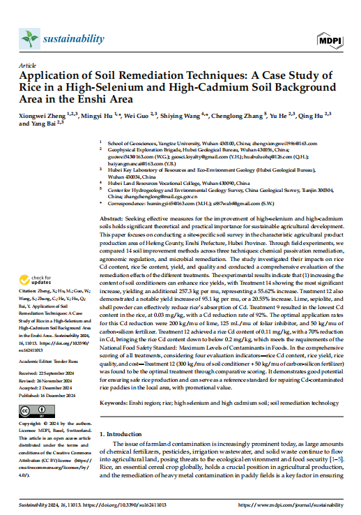 博士生郑雄伟在《Sustainability》上发表题为《Application of Soil Remediation Techniques: A Case Study ofRice in a High-Selenium and High-Cadmium Soil BackgroundArea in the Enshi Area》的研究论文。金碧娱乐场