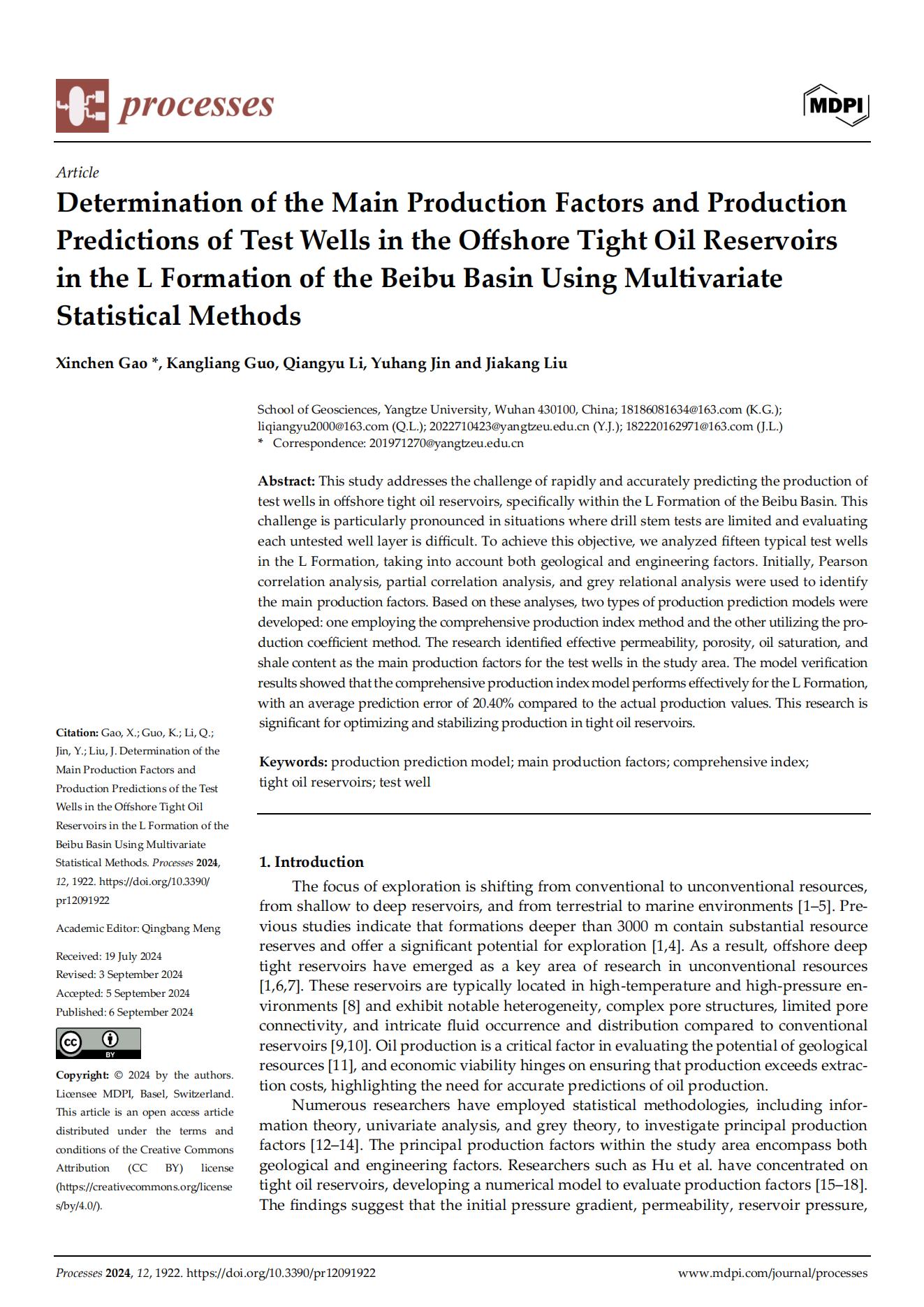 22级博士研究生在期刊《Processes》上发表题为“Determination of the Main Production Factors and Production Predictions of Test Wells in the Offshore Tight Oil Reservoirsin the L Formation of the Beibu Basin Using Multivariate Statistical Methods”的研究论文。金碧娱乐场