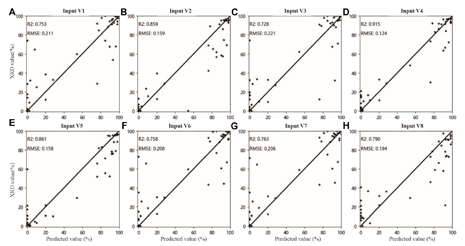 图1 模型预测值和XRD数据对比分析 (A-H)分别对应输入变量V1-V8