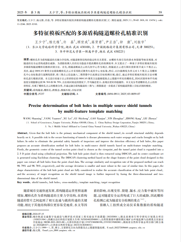 金碧娱乐场 硕士生王少宁在《测绘通报》上发表论文提出一种基于多特征模板匹配的多源盾构隧道螺栓孔自动识别方法 金碧娱乐场 硕士生王少宁在测绘领域期刊《测绘通报》上发表题为“多特征模板匹配的多源盾构隧道螺栓孔精准识别”的研究论文。 该研究主要针对盾构隧道激光扫描过程中螺栓孔因位置不一、姿态多样导致成像后目标形状不一的问题,以及盾构隧道内壁、渗漏水等对象因灰度值与目标较为相似对识别造成干扰的问题,本文提出了一种基于多特征模板匹配的多源盾构隧道螺栓孔自动识别方法(图1)。该方法将盾构隧道螺栓孔三维点云中心坐标用于锁定图像目标检测区域,利用螺栓孔灰度、形状以及梯度信息精准识别螺栓孔。在耗时相近的情况下,与同类方法相比,本文方法识别率提高了3.54%,识别精度提高了3.28%,最大像素偏差降低了4.68,平均偏差降低了1.35,具有更好的准确性和鲁棒性(图2)。 《测绘通报》(月刊)创刊于1955年,是由自然资源部主管、中国地图出版社有限公司主办、测绘出版社有限公司出版的反映我国测绘科技发展现状、推广测绘生产技术经验、指导全国测绘生产业务和服务自然资源监测的综合性、技术性刊物。包括大地测量、全球导航卫星系统(GNSS)、摄影测量、遥感(RS)、地图制图、地理信息系统(GIS)、工程测量、矿山测量、地籍测绘、海洋测绘等方面的新成果和新技术及其在生态环境保护、自然资源管理、土地、地质、矿产、水利、交通、电力、海洋等行业的应用情况。 论文链接: //kns.cnki.net/kcms2/article/abstract?v=_uHp55J8LtDnqTFs1238SvN7StedWuSMfLaybDHWb52o-GTDY-4HAMGDxTuJmfJ6uaB3GToGIEhOJEaMzBUOpcb-oj2UT0HCX7ZN2cUf44ynqpFXcqpf3MKLvdpFbJ5u7HwVbvFDBcIIqycaA_jRTi47ru52AzzQ2o8l1Q7-Cp3KmT1k-RqSrQ==&uniplatform=NZKPT&language=CHS 图1 盾构隧道螺栓孔识别原理图 方法 a b c 相似度区间识别个数 时间(s) 识别率(%) 平均相似度(%) 识别精度 形状 灰度 梯度 锁定匹配区域 [0.6-0.7] (0.7-0.8] (0.8-0.9] (0.9-1] √ × × × 0 1 0 17 54 276 232 6.876 47.69 87.40 8.99 0.05 5.20 √ × × √ 0 1 0 110 246 458 391 4.325 99.26 84.33 4.13 0 3.98 √ √ × × 0.3 0.7 0 0 0 114 1028 3.905 94.07 93.41 7.74 0 4.17 √ √ × √ 0.3 0.7 0 0 0 0 1202 1.463 99.01 97.81 4.21 0 2.96 √ √ √ × 0.2 0.7 0.1 0 0 99 1053 10.721 94.89 95.15 5.69 0 3.07 √ √ √ √ 0.05 0.9 0.05 0 0 0 1199 5.247 98.76 98.79 2.83 0 1.52 文献[10] 1 0 0 0 5 21 1130 7.745 95.22 95.51 7.51 0 2.87 图2实验结果对比 图3 论文