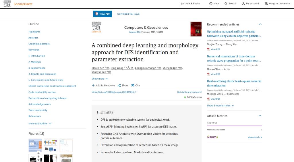 近日,金碧娱乐场 硕士生叶茂林在导师王庆副教授的指导下,于SCI二区期刊《Computers & Geosciences》发表题为《A combined deep learning and morphology approach for DFS identification and parameter extraction》的研究论文,提出一种融合深度学习与河流形态学的分布式河流系统(DFS)参数自动化提取方法,为沉积盆地分析与资源勘探提供了智能化解决方案。