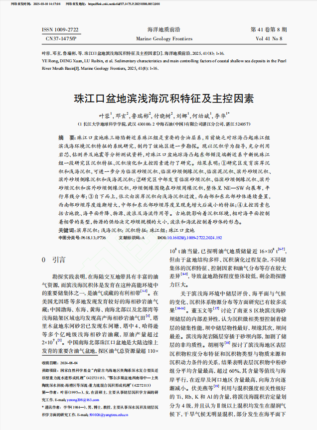 地质学专业2022级硕士研究生叶蓉在中文核心期刊《海洋地质前沿》发表题为“珠江口盆地滨浅海沉积特征及主控因素”的研究论文。金碧娱乐场