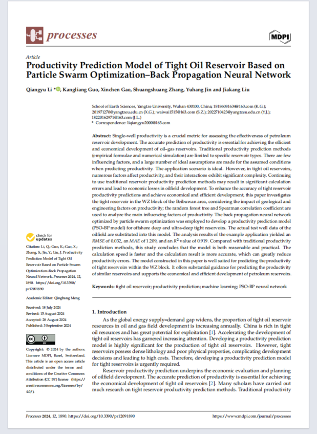 地质学专业2022级硕士研究生李强裕在中科院三区期刊《Processes》发表题为“Productivity Prediction Model of Tight Oil Reservoir Based on Particle Swarm Optimization–Back Propagation Neural Network”的研究论文。金碧娱乐场