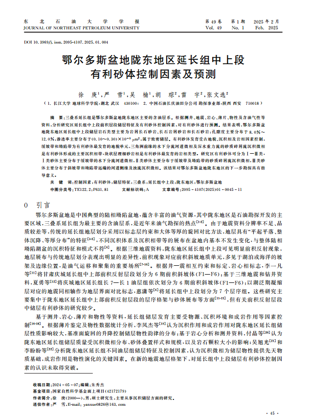 硕士生徐庚在《东北石油大学学报》上发表题为“鄂尔多斯盆地陇东地区延长组中上段有利砂体控制因素及预测”的研究论文。金碧娱乐场
