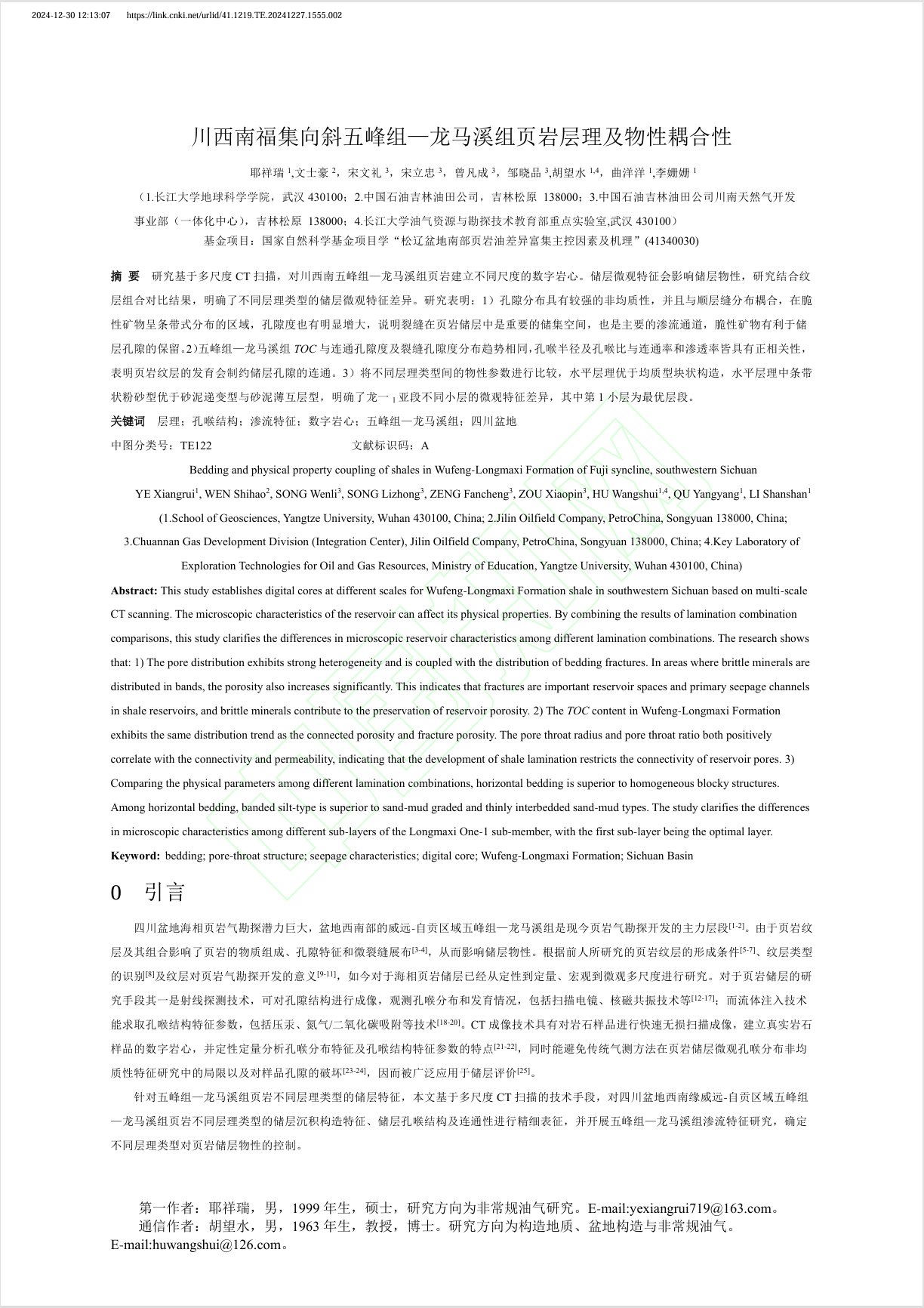 金碧娱乐场 硕士生耶祥瑞在《断块油气田》上发表题为“川西南福集向斜五峰-龙马溪组页岩层理及物性耦合性”的研究论文。金碧娱乐场 为论文第一署名单位,硕士生耶祥瑞为论文第一作者,教授胡望水为通讯作者。