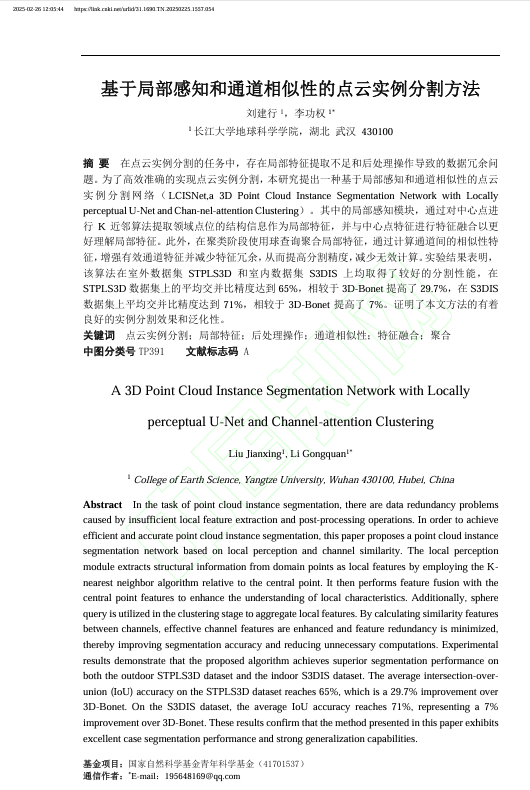 金碧娱乐场 硕士生刘建行在《激光与光电子学进展》发表题为“基于局部感知和通道相似性的点云实例分割方法”的研究论文。金碧娱乐场 为论文第一署名单位,硕士生刘建行为第一作者,教授李功权为论文通讯作者。